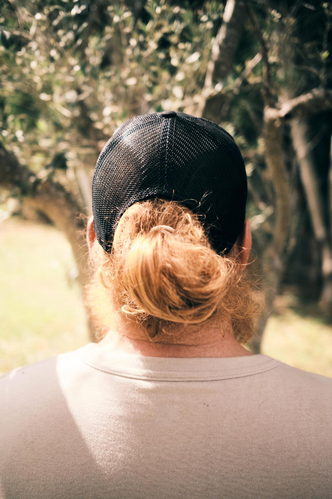 Black on black with a custom Garrison supply Co logo leather patch sewn right in front of a Sonic Trucker Hat.